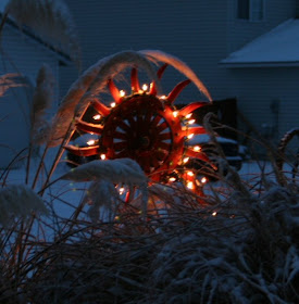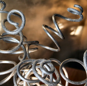 In years past, I always went to the store for some small evergreen trees/shrubs for the planters, but this year I decided to use what I had at hand.... After trimming off the dead stuff, I filled the planters up with light green pebbles & went gathering all the aluminum skwigglys I could find....this took me all around the garden, in the garage, in the house, & I considered thieving some from the next door neighbors that I gave them this summer; but in the end I restrained myself & had plenty anyhow... :) I scrounged up some copper coated stick things too, along with a few other items...