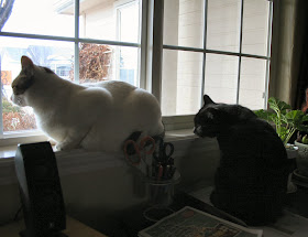 Skwishy Cat & Beasty: looking out at all the snow....& helping with office organization by tearing paper, carrying off pens, & generally making pests of themselves....