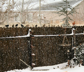 The view of the back yard; I've been feeding the birdies all year: the snow storm seemed to bring in even more than usual! The hung out all day & entertained the cats; picture at least 3 kitties at the window watching the show :)