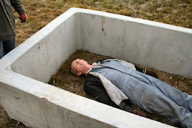 And, we made another crypt... Too funny; actually, this will make a lovely seating area, & there are berry bushes planted already that will grow up through the void. I may add a few sculptural touches too, since there are threaded holes in the top. After staining, & when the rest of the plantings grow up a bit, it's going to make a lovely bench area :)
