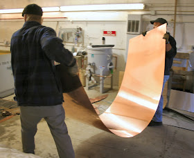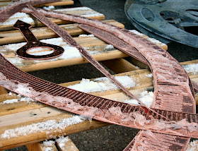 In other news on the project: most of the pieces are cut & waiting to be assembled; my brass is on back-order, so it will be next week before we can get it cut. Kevin is working away on engineering the hoist assembly to lift the sculpture into place, & then be able to lower & raise it in the future for cleaning. We are meeting again at City Hall next week to look in the ceiling & figure out cable runs, beam attachments, etc. I'll post more on that process next week....