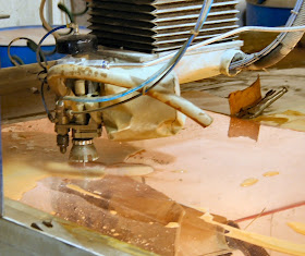 The water-jet cuts through the copper like it's nothing: it will even cut through plate steel, stone, glass, tile: pretty much anything...an amazing tool. It uses a high pressure jet of water with an abrasive sand; crushed garnet, to cut with speed & precision.