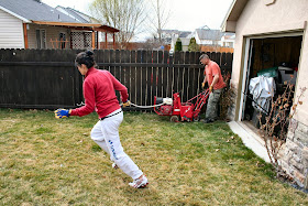 And away we go; Kevin cutting the first strip of sod; we decided to go ahead & take out the sod 1/2 the back yard too; going to put a path of wide reclaimed concrete stepping stones from the side walk to the shed: leaving only about 3 feet on each side of the path: who needs to mow that?! Alysa--running to mark sprinkler heads: we only destroyed one in this whole project....