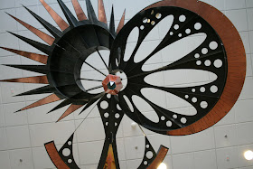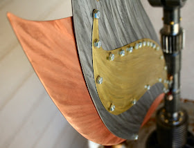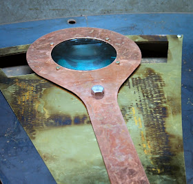 This cute little sculpture has been sitting in the shop for weeks now, just waiting for some TLC :) I finally got to work on it yesterday & am almost done: in the pic, it's just in mock-up stage: afterwards I took the brass, copper, & stainless off & textured them with the grinder; gives a beautiful, dimensional finish, but takes forever! Then, put them all back together again to rivet together & discovered that some of the holes I drilled were too big for a clean rivet tail: I must say, my skills at drilling through 4 layers of thin stuff & having everything line up in the end are lacking....but oh well. New plan; will get some cute little nuts & bolts today to attach everything--I like little bolts anyway--maybe I'll even get some colored washers too... Anyway, then I'll be able to mount the sail thing to the piece & it will be done!! It's a spinner,