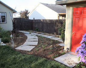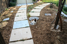 The front side of the house; planted lots of heirloom variety tomotoes, peppers, a little herb garden, & beans to grow on the sculptures...