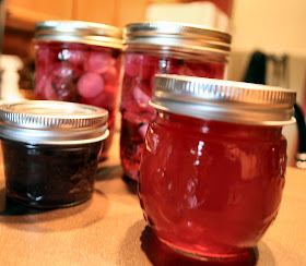 And, while I was making a mess in the kitchen, I decided to make some pickled radishes: since I have tons of the things, & I'm the only one who will eat them raw: thought maybe the husband & the girl might actually eat them as pickles...we'll see. The jars turned out so pretty: the skins turn the pickeling liquid a nice purplely-pink color...we'll find out later if they taste ok....