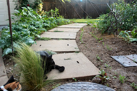 The back veggie patch; & kitties. They are convinced that I planted this feather grass clump especially for them--it's their